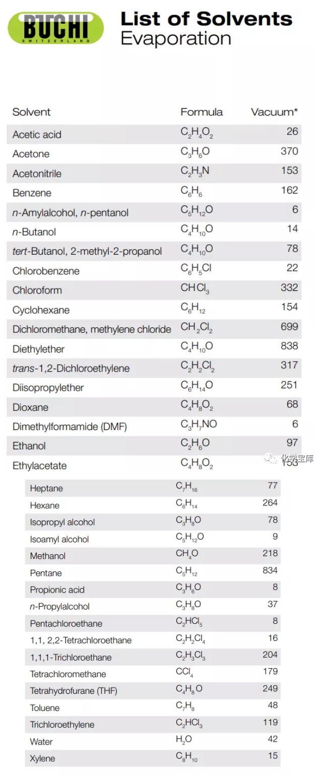 通過(guò)調(diào)節(jié)水浴鍋溫度,真空系統(tǒng)和冷卻溫度,可以實(shí)現(xiàn)能量補(bǔ)給和消除之間的良好平衡。今天,送大家一張Buchi公司的溶劑真空度表,蒸什么溶劑用多大壓力一目了然,再也不怕溶劑噴了。