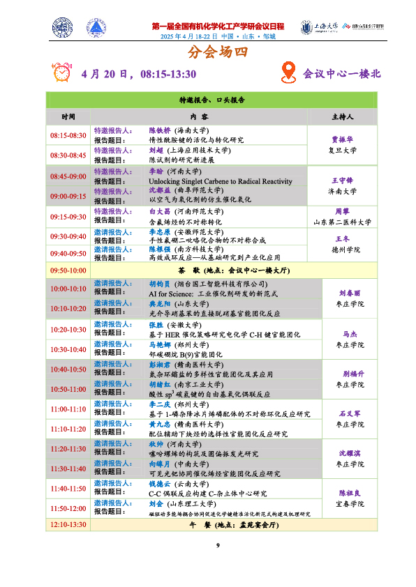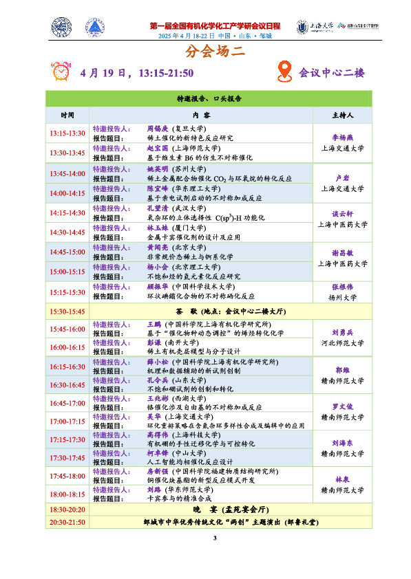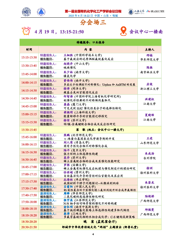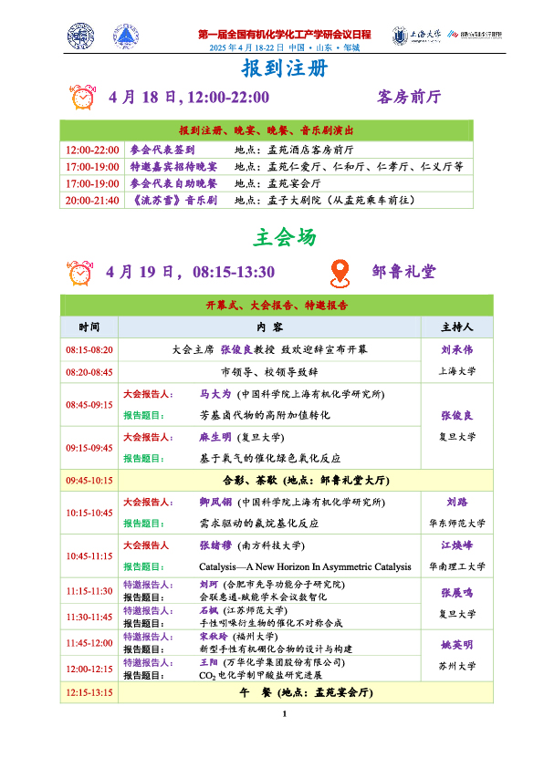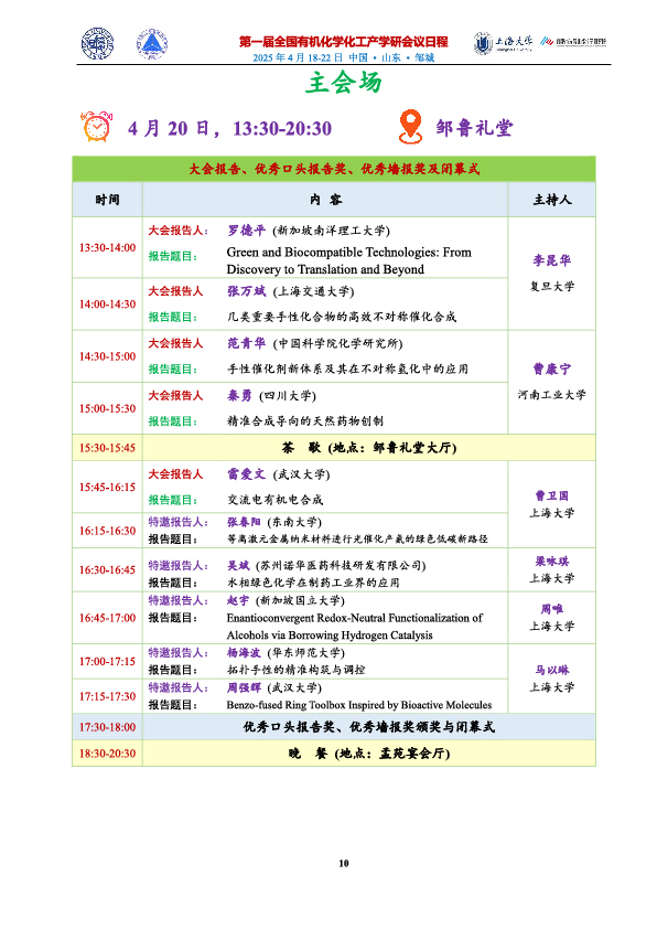 第一屆全國有機化學化工產學研會議于2025年4月18日—22日在山東省鄒城市孟苑(孟子故里)成功舉行。本次會議由復旦大學、中國科學院上海有機化學研究所主辦,上海大學、合肥市先導功能分子研究院承辦,曲阜師范大學、棗莊學院協(xié)辦。會議集全國有機化學化工及相關領域的知名專家、企業(yè)家、青年學者等于一堂,討論有機化學化工領域最新政策、科學與技術進展,交流分享最新學術成果、科技產業(yè)成果,促進有機化學化工領域學術與工業(yè)界的深度融合與發(fā)展,助力地方化學化工領域經濟的可持續(xù)發(fā)展。
