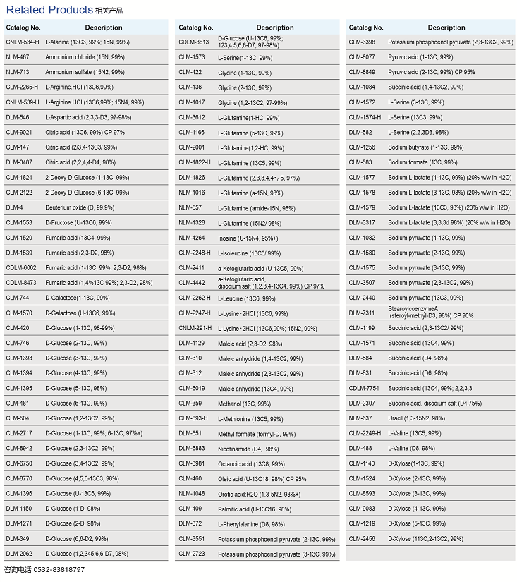 同位素示蹤劑是代謝研究中重要的工具。為了測定培養哺乳動物細胞內中心碳代謝途徑代謝通量,我們向動物細胞培養基中添加D -葡萄糖(13C6, 99%) (CLM-1396)或L -谷氨酰胺(13C5, 99%) (CLM-1822)。細胞通過在同位素標記的培養基中進行培養,其代謝物可以通過用GC / MS或LC / MS進行檢測。在傳統研究中,葡萄糖通常被認為是許多細胞,特別是癌細胞的主要碳源。然而,最近的研究表明,谷氨酰胺通常在三羧酸(TCA)循環中起主導作用。谷氨酰胺對三羧酸循環中四碳化合物的作用,可以通過對蘋果酸鹽和天門冬氨酸標記來檢測,而對三羧酸循環中二碳化合物的作用可以通過乙酰輔酶A和脂肪酸標記來檢測。檸檬酸是一種信息非常豐富的分子,在三羧酸循環中它對二碳化合物以及四碳化合物都有相關作用。使用質譜等現代化的儀器,可以同時測量所有這些所有同位素標記的化合物,從而實現系統級通量定量。這些方法也可以應用于生物體內環境,在切除腫瘤或其他組織標本之前,給小鼠或患者注入同位素標記的營養素。代謝在生物工程和疾病病理生理學中具有非常總要的意思,也使得同位素在生物化學科學中的得到越來越廣泛應用。