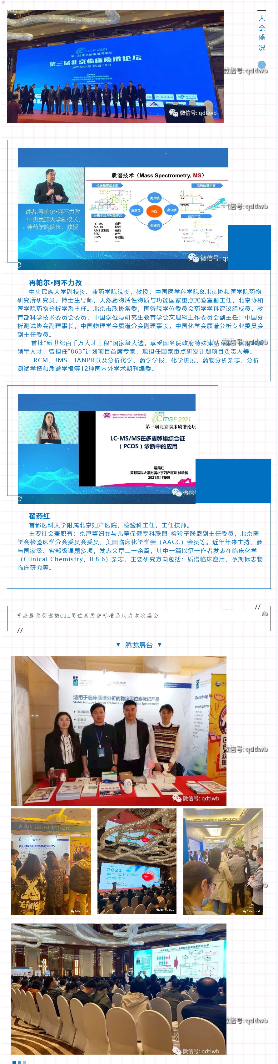2021年4 月 9 日至 4 月 10 日,“第三屆北京臨床質譜論壇”在在北京昆侖酒店成功舉辦。兩百余位業界專家、學者、管理人員齊聚一堂,共同探討質譜在疾病診斷、血藥濃度監測、新生兒疾病篩查、中毒診斷、臨床轉化研究中的應用。