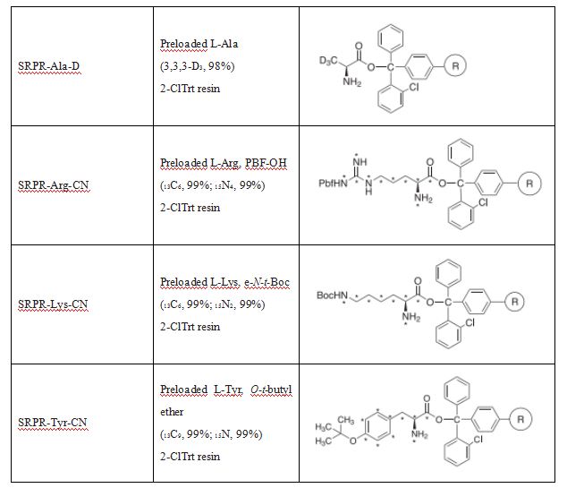 通過與新英格蘭肽公司(NEP)的合作,CIL可以提供合成預載樹脂,以幫助固相合成穩定同位素標記的胰蛋白酶肽。這些2-氯三酰(2-ClTrt)樹脂最初由Barlos及同事發現的,非常適合合成同位素標記的胰蛋白酶肽,用作穩定同位素稀釋質譜(SIDMS)分析中的定量標準。這些樹脂是由具有最高化學、同位素和手性純度的標記的、受保護的氨基酸制備的。此外,由于2-ClTrt樹脂在負載過程中不發生對映體化,因此,2個含有同位素標記殘基的肽基本上不受非對映體副產物的污染。