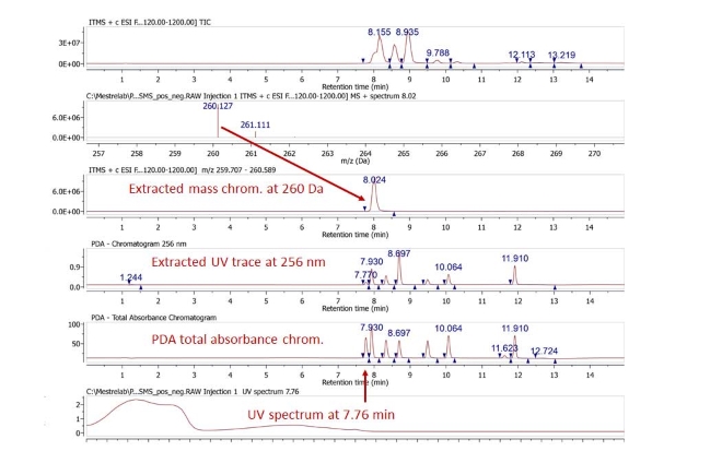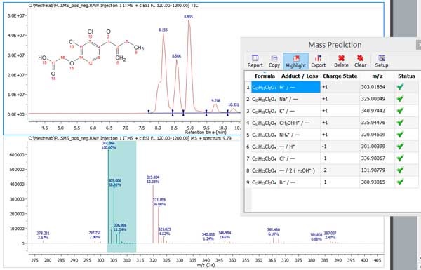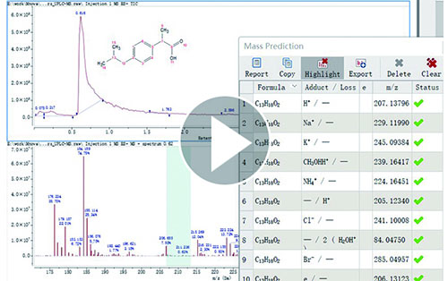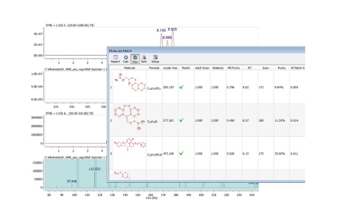 除NMR插件中利用核磁共振數據進行結構確認的許多工具以外,在Mnova MS中的分子匹配功能可以通過LC/GC/MS數據進行結構確認;