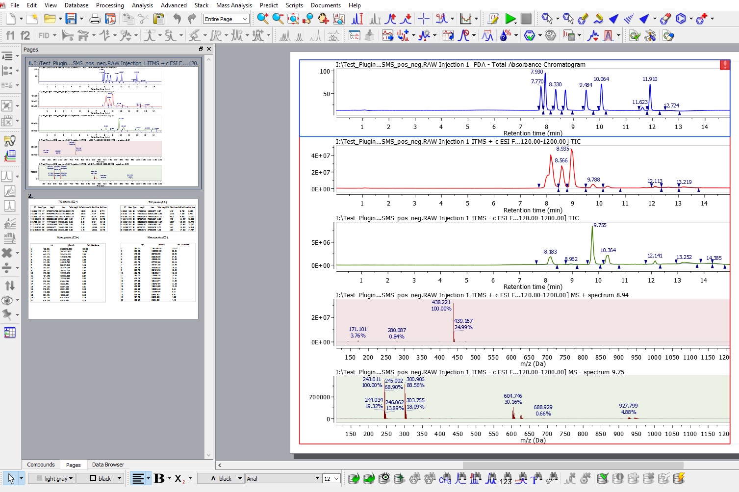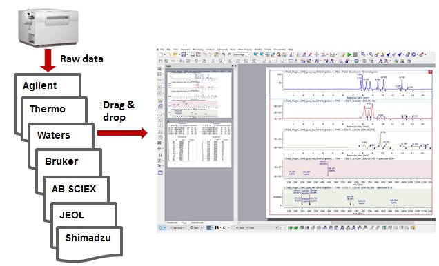 可以打開來自不同儀器(Agilent、Bruker、JEOL、Thermo、Waters)以及mzData或mzXML格式的數據;自動或手動對TIC、MS、UV/ELSD進行峰積分;根據TIC峰、是否扣除背景選擇質譜,并以centroid或profile模式顯示;可以手動添加質譜,也可以在同一文檔中打開NMR和MS數據,并同時對其進行分析報告。