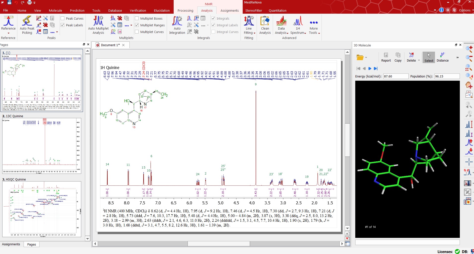 自動譜圖分析從未如此強大。我們的自動分析執行全譜去卷積 (GSD)(包括分辨率增強步驟)以分離所有可用信號。然后,軟件對特定類別(化合物、雜質、13C衛星、溶劑等)內的每個單獨峰進行表征和標記,并在完成該步驟后,分析化合物信號,將其分組為相關多重峰,進行積分、標記等。全自動的過程將使您在分析譜圖時得到理想的結果,并且,如果您想要優化分析,Mnova在每個步驟都具有交互控制。