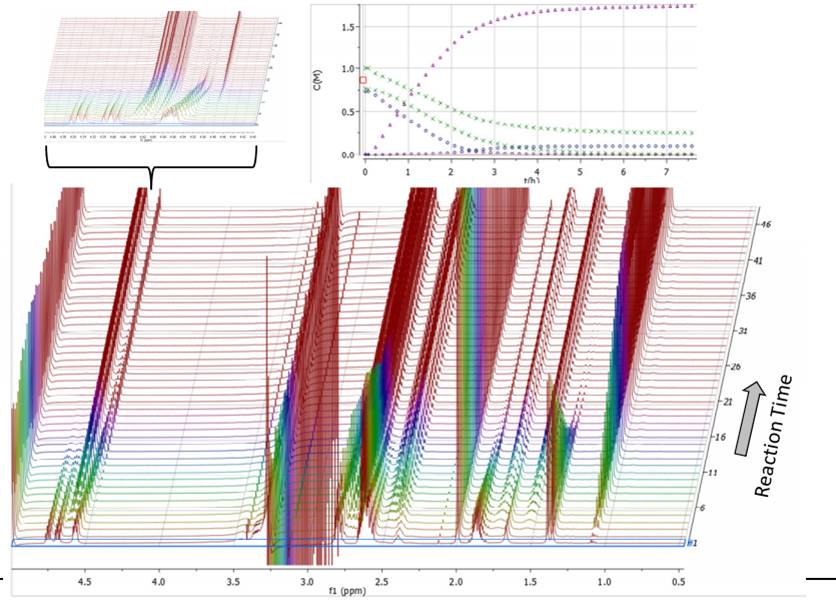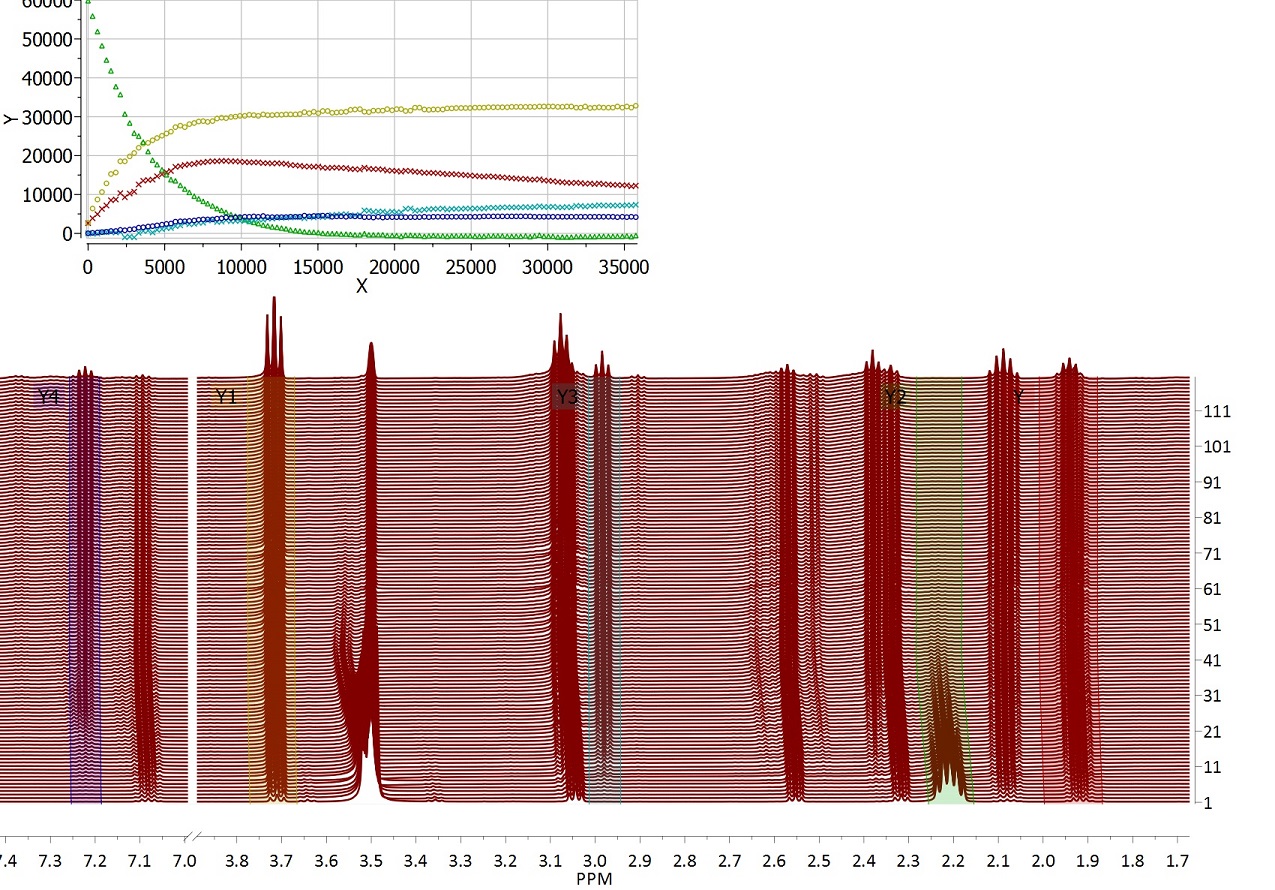 從NMR數(shù)據(jù)集中獲取化學(xué)反應(yīng)的動力學(xué)信息 Mnova RM(Reaction Monitoring)可以為疊加的NMR數(shù)據(jù)集提供基礎(chǔ)處理功能,并且可以在數(shù)據(jù)集中提取譜圖,計算化學(xué)反應(yīng)動力學(xué)濃度。 > 獲取license |